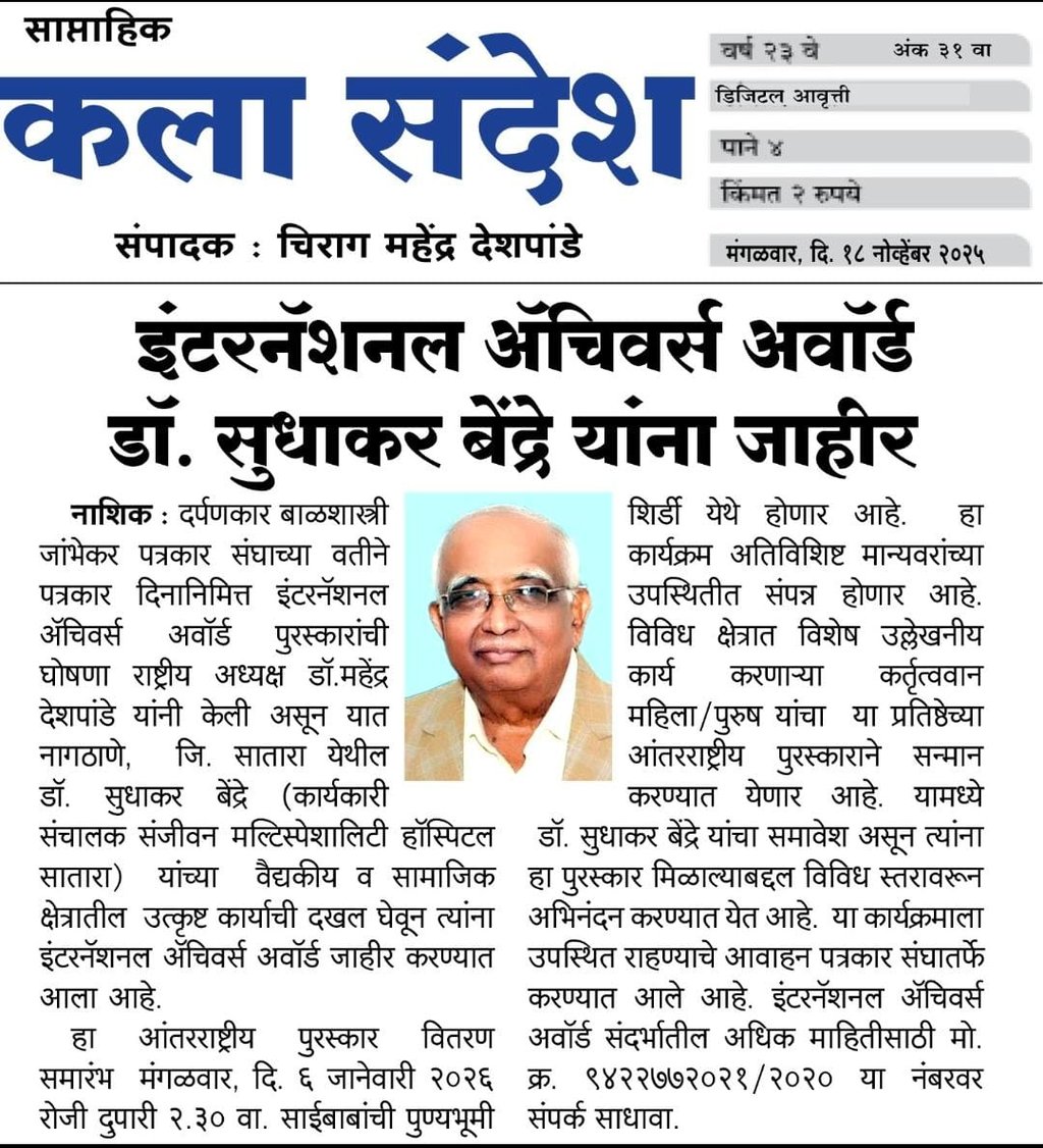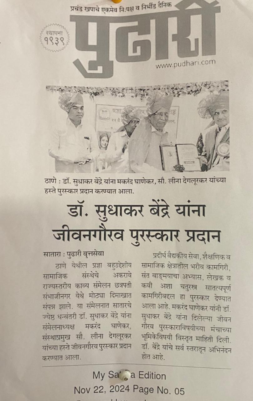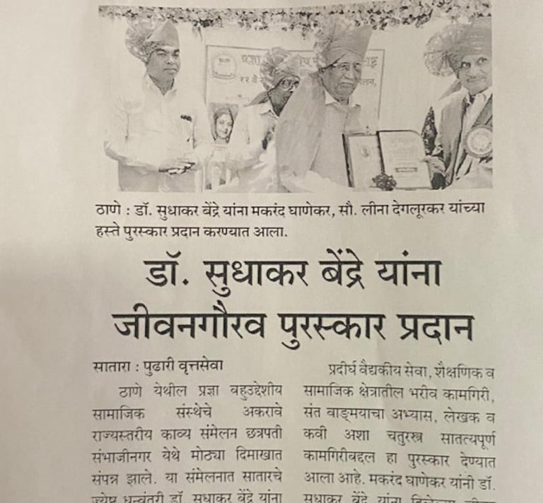 Renowned medical practitioner and social contributor Dr. Sudhakar Bendre of Satara has been conferred with the Lifetime Achievement Award by the Pragya Multipurpose Social Organization, Thane, during the State-Level Kalnirmiti Conference.