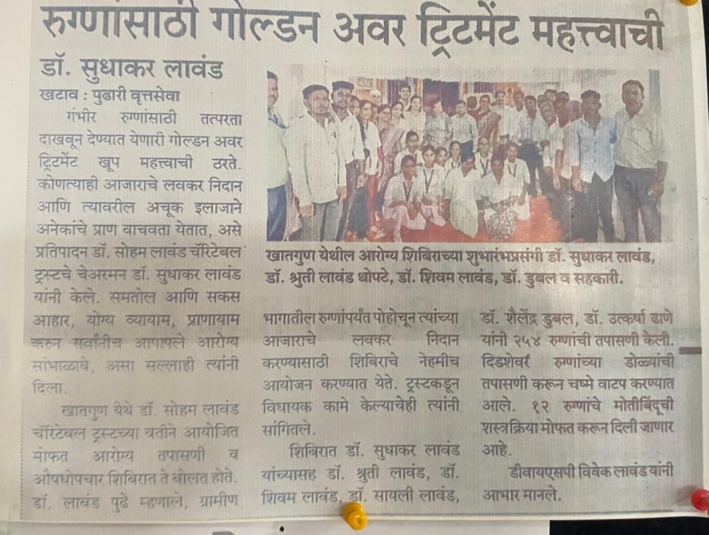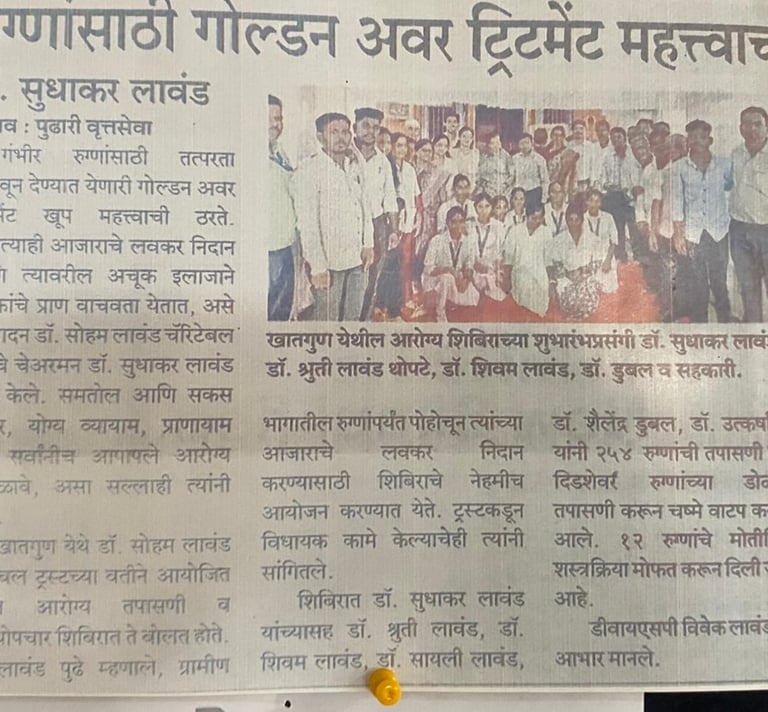 The Soham Lawand Charitable Trust, under the guidance of Dr. Sudhakar Lawand, recently organized a special health awareness and medical camp to educate people on the importance of the Golden Hour Treatment — a crucial period immediately following a serious injury or medical emergency when timely care can save lives.