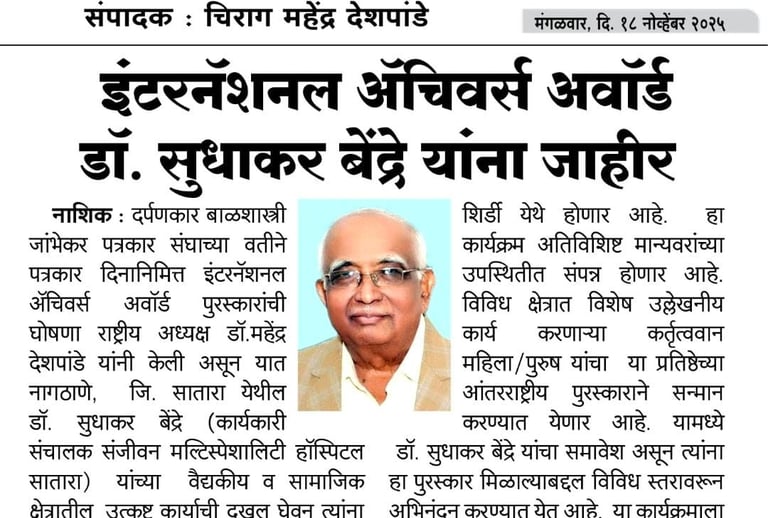 Sanjeevan ICU Pvt. Ltd., Satara proudly congratulates our Managing Director – Dr. Sudhakar Bendre for being selected for the prestigious International Achievers Award, recognizing his outstanding contribution to the medical and social sectors.